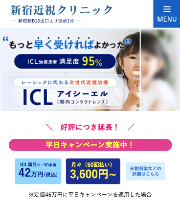 | 新宿近視クリニック | レーシック・ICL | レーシック15.4万円〜 / ICL42万円〜 | 累計11万件以上 | 最大3年保証 | 新宿駅 徒歩1分 |