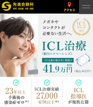 | 先進会眼科(東京新宿) | レーシック・ICL | レーシック22万円〜 / ICL46万円〜 | 累計10万件以上 | 最長3年保証 | 西新宿駅 徒歩2分 |